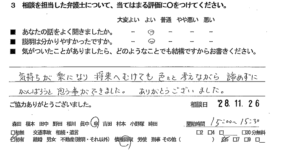 お客様の声(相談者の声) 公開日:2018/08/31 2018年8月31日 お客様の声気持ちが楽になり、将来へむけても色々と考えながら諦めずにがんばろうと思う事ができました。ありがとうございました。■あなたの話をよく聞きましたか:よい ■説明はわかりやすかったですか:よい「お客様の声(相談者の声)」「お客様の声(相談者の声)」