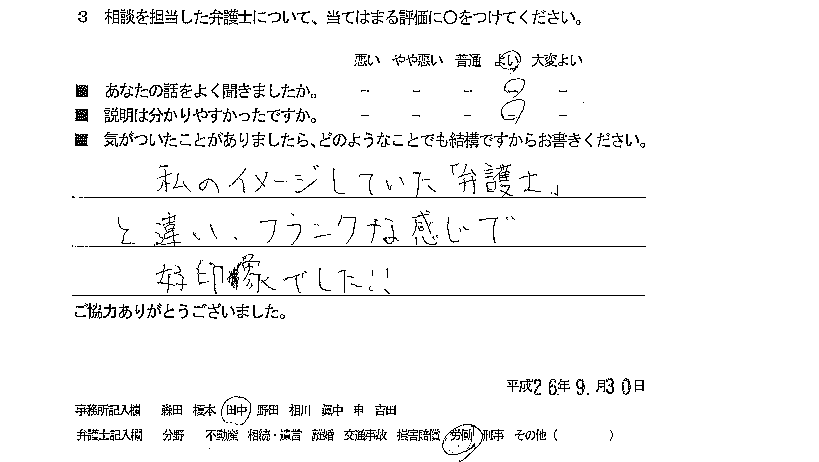 お客様の声47 公開日:2015/07/27 公開日 : 2015年7月27日 / 更新日 : 2015年7月28日 お客様の声私のイメージしていた「弁護士」と違い、フランクな感じで好印象でした。■ あなたの話をよく聞きましたか。 よい■ 説明は分かりやすかったですか。 よい「お客様の声48」「ご依頼者の声46」