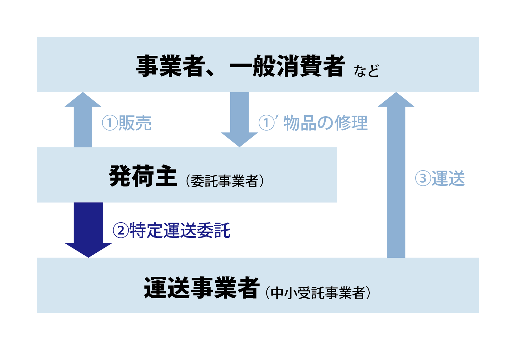 1人目が、委託する人(運送を頼む人)です。要するに荷主ですね。制度上は「初荷主(はつにぬし)」と呼ばれます。上記の条文で最初に出てくる「事業者」というのがこれに当たります。